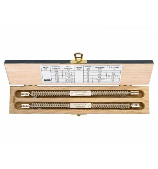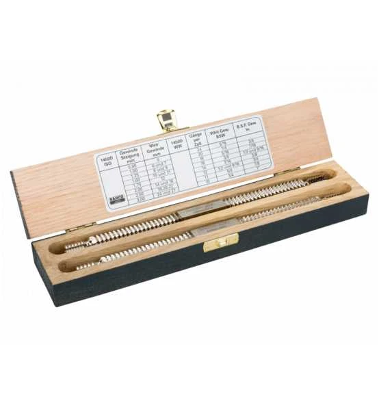 - Acht metrische Gewindesteigungen und acht Größen für Gewindegänge pro Zoll