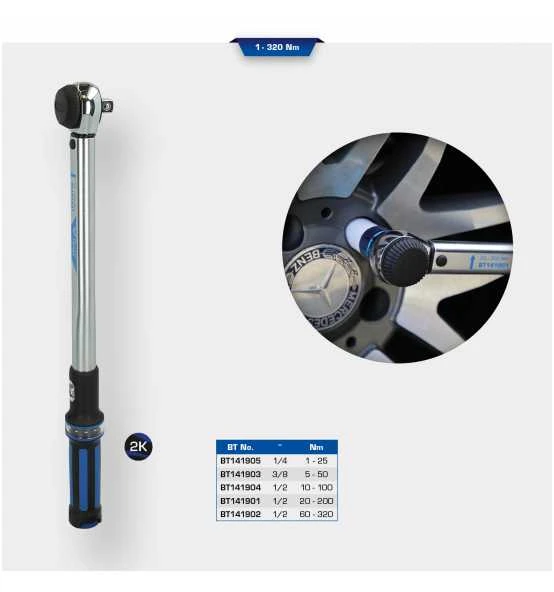 Mithilfe dieses BRILLIANT TOOLS Profi-Drehmomentschlüssels BT141902 lassen sich Schrauben und Muttern kontrolliert anziehen. Seine Einsatzmöglichkeiten sind sehr vielseitig. Die exakte Einstellung des gewünschten Drehmoments ist denkbar einfach und lässt sich sehr gut an der im Griff integrierten Skala ablesen. Auch die Feineinstellung, dank Mikrometerskala, ist hier möglich. Damit lassen sich Werte wie z.B. 122 Nm realisieren. Zum Einstellen muss nur die Verriegelung im Griff gelöst und dieser bis zum gewünschten Wert gedreht werden, anschließend wieder verriegeln. Durch den Drehmomentbereich von 60 – 320 Nm lassen sich verschiedenste Arbeiten an PKW oder Transporter erledigen. Der gut hör- und fühlbare Auslöse-Mechanismus, signalisiert Ihnen das Erreichen des eingestellten Drehmoments. Sein 1/2″ Kopf kann umgesteckt werden und ist somit für Rechts- und Linksgewinde geeignet.