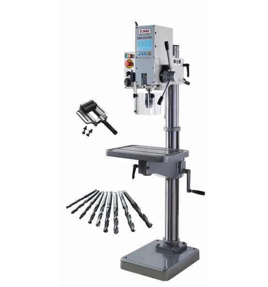 – Getriebe-Tischbohrmaschine GBM 3/25 TNE bzw. SNE- Maschinenschraubstock 125 mm- Zwei Spannschrauben 14 mm- Bohrerkassette 9-teilig, 14,5 mm – 30 mm MK 2 / MK 3