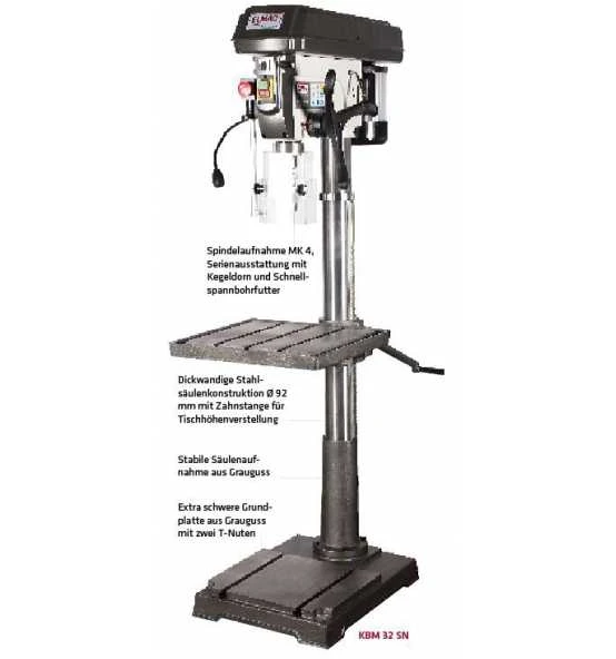 Mit einem maximalen Pinolenabstand zum Bohrtisch von 700 mm ermöglicht die KBM 32 SN die Bearbeitung von hohen Werkstücken und fertig geschweißten Bauteilen. Spannnuten in der Grundplatte erweitern den Spielraum für hohe Formteile.Die Maschine ist daher gut für Reparaturen in der Landwirtschaft und für den Rahmenbau in Metallbaubetrieben geeignet. Sie fällt durch eine grundsolide Ausführung und eine gute Serienausstattung auf.Rechts-/Linkslauf.
