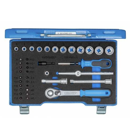 Mit geschmiedeten, vergüteten Sechskant-Steckschlüsseleinsätzen und Betätigungswerkzeugen, in GEDORIT blauer Stahlblechkassette.
