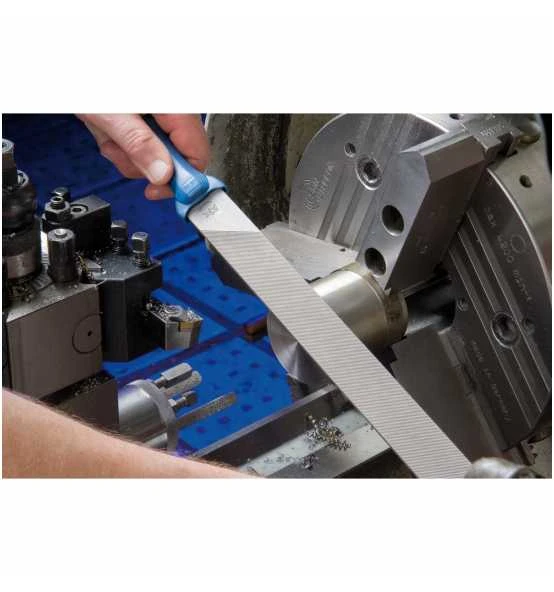- Sicheres Arbeiten, da sich die Feile durch den gegenläufigen Hiebverlauf auf Vorder- und Rückseite beim Arbeiten auf der Drehbank vom Spanfutter weg bewegt