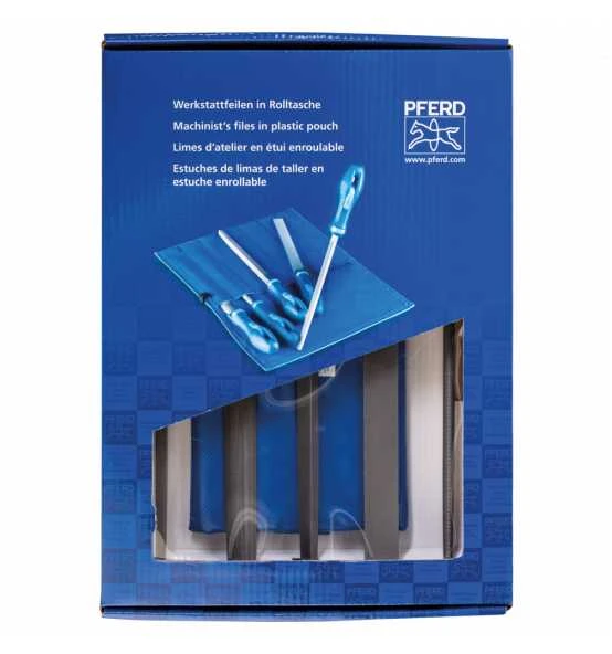 Qualitätsfeilen für Industrie und Handwerk in schützender und klimafester PVC-Rolltasche zur Aufbewahrung im Werkzeugkoffer oder auf der Werkbank.
