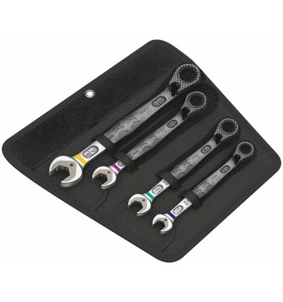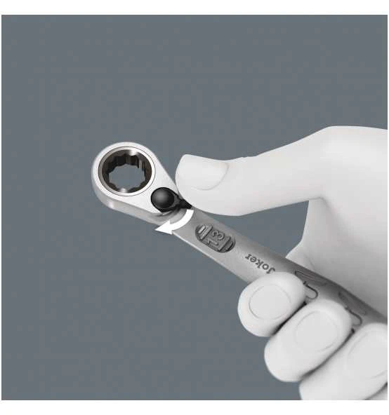 Hochwertiger Ringratschen-Maulschlüssel-Satz von Wera: Joker Maulringratschenschlüssel mit abgewinkelter Ratschenseite und Umschalthebel.