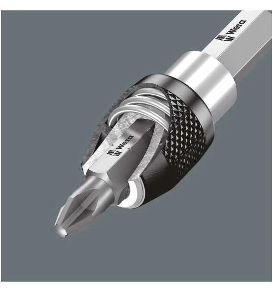 Geeignet für die Aufnahme von Bits mit 1/4″- Außensechskantantrieb nach DIN ISO 1173-C 6,3 und Wera Anschluss-Reihe 1.