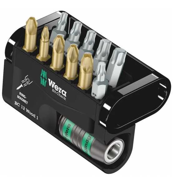 Inklusive Universalhalter mit Ringmagnet, der auch schwere Schrauben bombenfest hält und Rapidaptor, der eine Aufnahme der Bits auch ohne Betätigung der Hülse erlaubt.