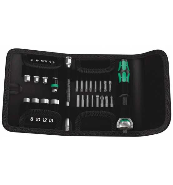 26-teilig in Falttasche zur Befestigung am Gürtel.1 Zyklop-Knarre mit 1/4″-Antrieb, 7 Zyklop-Nüsse (metrisch), 1 Zyklop-Verlängerung (lang) mit Schnelldrehhülse, 1 Verbindungsteil, 16 Bits in 50 mm Länge.