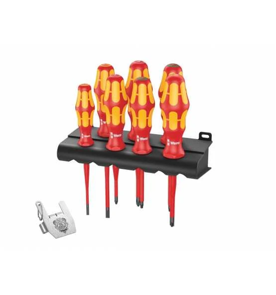 7-teiliges VDE Schraubendreher-Set, teilweise mit reduziertem Klingendurchmesser und integrierter Schutzisolation, so können tiefliegende Schraub- und Federelemente erreicht und betätigt werden; stückgeprüfte Werkzeuge gem. IEC 60900; Stückprüfung bei 10.000 V für sicheres Arbeiten bei der zugelassenen Spannung von 1.000 V. Take it easy“ Werkzeugfinder mit Farbkennzeichnung nach Profilen und Größenstempelung zum einfachen und schnellen Finden des benötigten Werkzeugs. Abrollschutz verhindert lästiges Wegrollen am Arbeitsplatz. Der Clou: Ein Schlüsselanhänger, der als Tool Rebel Gruß geformt ist und selbstverständlich auch als Flaschenöffner dient.